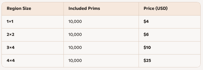 Low-impact, low prim, low-cost regions. No prim add-ons available.