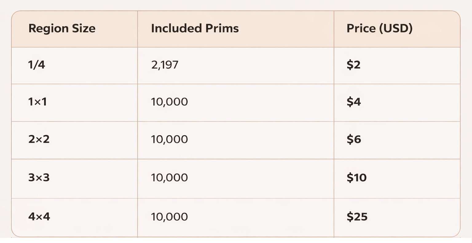 - Low-impact, low prim, low-cost regions. No prim add-ons available.